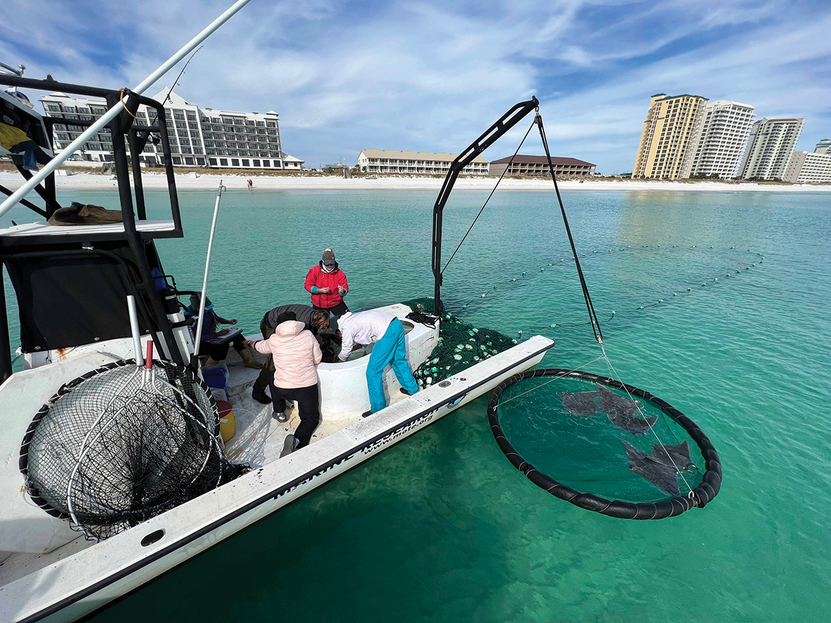 In November, Mote researchers, along with the Okaloosa County Coastal Resource Team, found 17 rays and tagged seven with acoustic tags the size of a small battery. Tracking the movement of the rays will help determine why the rays migrate to the Destin-Fort Walton Beach area in the fall and winter months.
