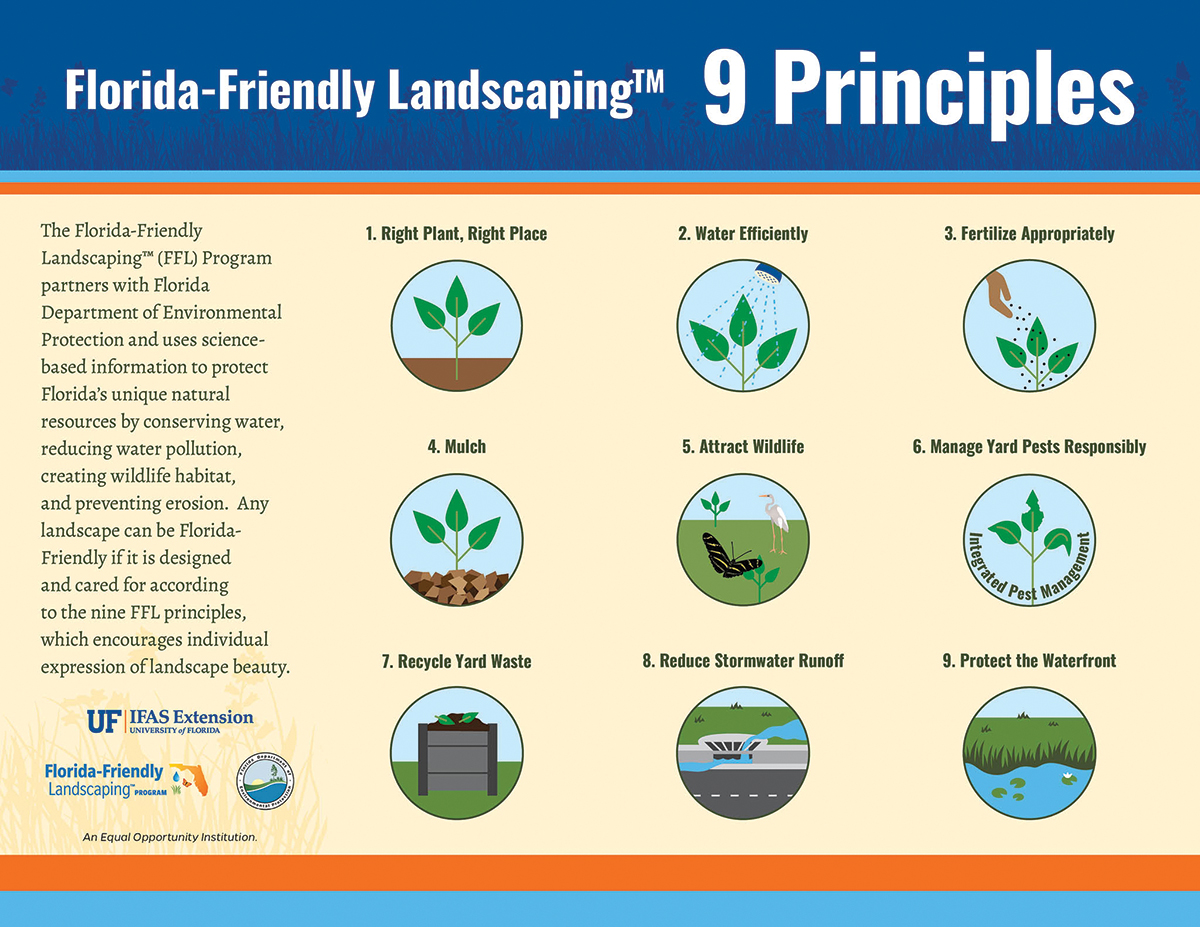 Florida-Friendly Landscaping™ teaches Floridians how to work with the unique climate, soil, and other landscape challenges we face. The nine FFL principles with brief descriptions are listed below: