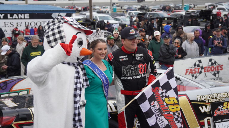Stephen Nasse (left) flanked by Ms. Snowball Derby (center) and track mascot, Snowball, after the 58th Annual Snowball Derby.