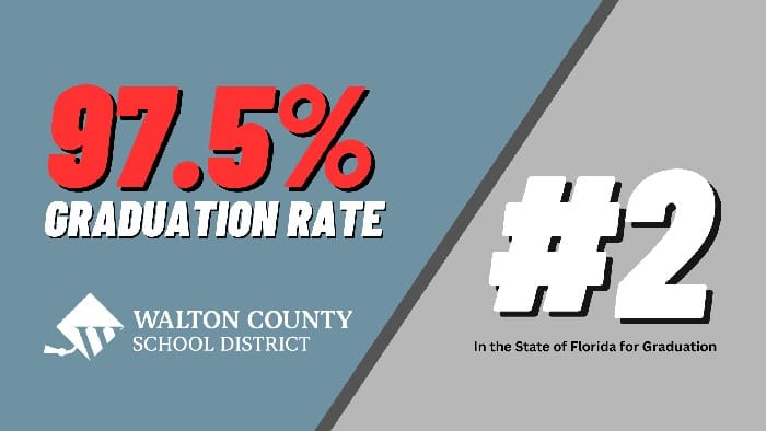 Walton County School District ranks No. 2 in the state of Florida for graduation rate, posting a 97.5% graduation rate – just 0.1 percentage points behind the No. 1 district statewide. The district also saw a 0.1% increase over last year’s graduation data.